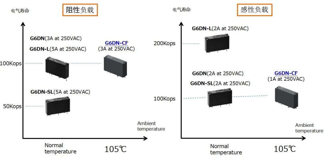 在高温环境下,常规继电器通常需要降低额定值以适应工作温度要求。随着FA设备向小型化发展,零件更加精密,这导致内部温度升高,从而增加了部件对耐高温的需求,而G6DN-CF正是为解决这一挑战而诞生。