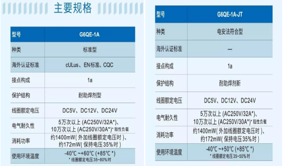 从线圈电压功耗方面看,G6QE系列在施加电压100毫秒之后降低施加至线圈上的电压与额定线圈功耗相比,其功耗减小至12%,有助于设备的节能和降低发热。