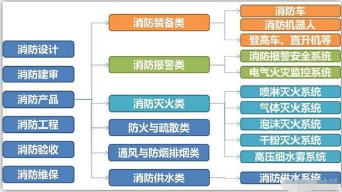 消防产业链中,主要分为消防设计、消防建审、消防产品、消防工程、消防验收、消防维保等环节。