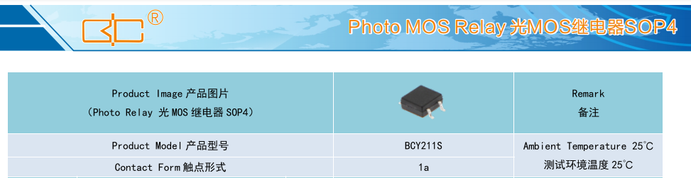 Relay 光MOS 继电器 SOP4, Product Model产品型号:BCY211S, Contact Form触点形式:1a, Ambient Temperature 25C, 测试环境温度 25℃C