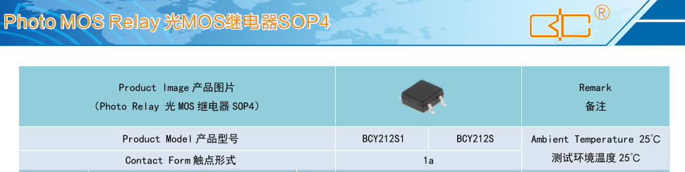 (Relay 光 MOS 继电器 SOP4),Product Model产品型号:BCY212S1、BCY212S,Contact Form触点形式:1a,Ambient Temperature 25'C,测试环境温度 25℃
