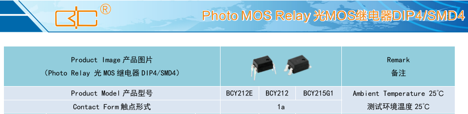 (Relay 光 MOS 继电器 DIP4/SMD4),Product Model产品型号:BCY212E/BCY212/BCY215G1,Contact Form触点形式:1a,Ambient Temperature 25C,测试环境温度 25℃