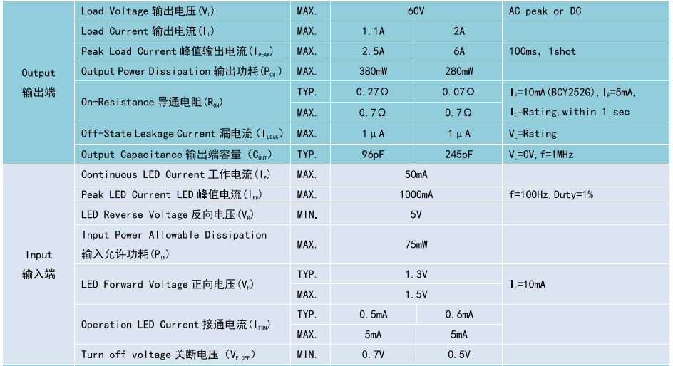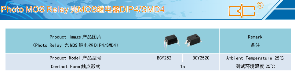 (Relay 光 MOS 继电器 DIP4/SMD4),Product Model产品型号:BCY252、BCY252G,Contact Form 触点形式:1a,Ambient Temperature 25°C测试环境温度 25℃