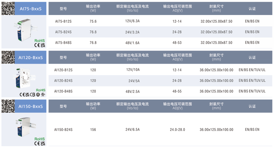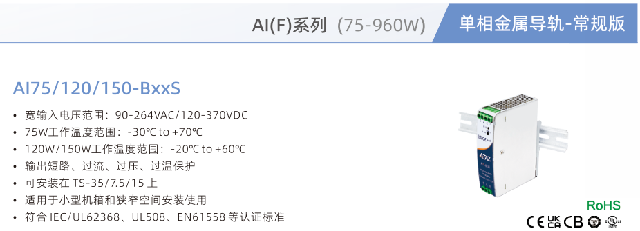 开关电源A175/120/150-BxxS, •宽输入电压范围:90-264VAC/120-370VDC •75W工作温度范围:-30°Cto+70℃ •120W/150W工作温度范围:-20°Cto+60°C •输出短路、过流、过压、过温保护 •可安装在 TS-35/7.5/15 上 •适用于小型机箱和狭窄空间安装使用 •符合IEC/UL62368、UL508、EN61558等认证标准