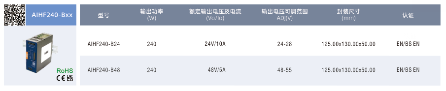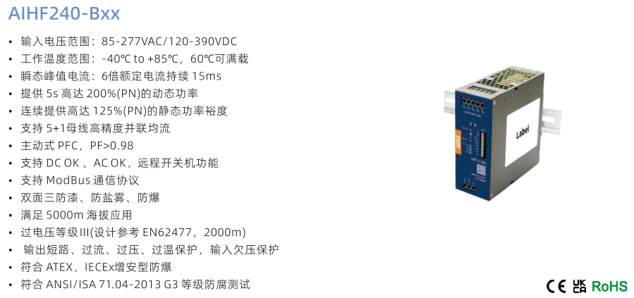 开关电源AIHF240-BxX, •输入电压范围:85-277VAC/120-390VDC •工作温度范围:-40℃to+85℃,60℃可满载 •瞬态峰值电流:6倍额定电流持续15ms •提供 5s 高达 200%(PN)的动态功率 •连续提供高达125%(PN)的静态功率裕度 •支持 5+1母线高精度并联均流 •主动式 PFC,PF>0.98 •支持 DCOK、ACOK、远程开关机功能 •支持 ModBus 通信协议 •双面三防漆、防盐雾、防爆 •满足 5000m 海拔应用 •过电压等级I(设计参考EN